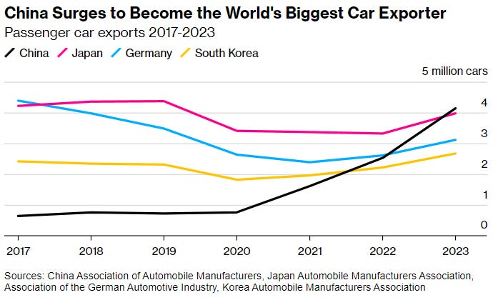 “En 2014, China vendió 75.000 vehículos eléctricos e híbridos y exportó 533.000 automóviles. Si avanzamos hasta 2024, China vende más vehículos eléctricos que cualquier otro país, con 9,5 millones de automóviles entregados el año pasado. También controla la mayor parte de la cadena de suministro de baterías. El campeón nacional BYD superó en el último trimestre de 2023 a Tesla como mayor productor mundial de vehículos eléctricos. China también superó a Japón como mayor exportador de automóviles, enviando 4,14 millones de unidades al extranjero, de las cuales 1,55 millones eran VE o híbridos enchufables." Linda Lew en Bloomberg (en inglés).