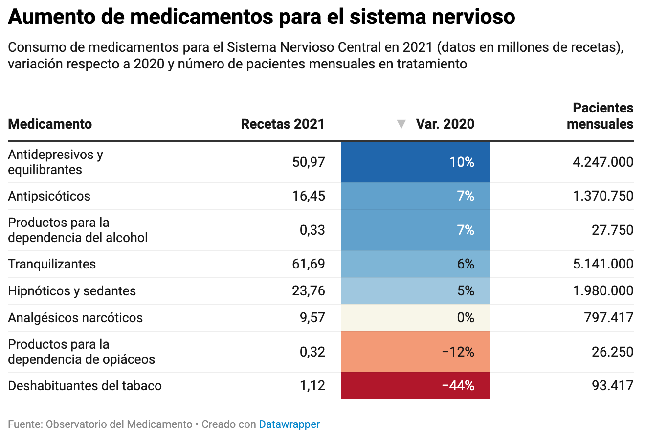 “La venta de antidepresivos se dispara en España un 10% en un año”. El Observatorio del Medicamento señala que en 2021 se dispensaron casi 51 millones de recetas de estos fármacos, un incremento “que responde al aumento de esas patologías psicológicas y psiquiátricas de los últimos dos años” Cristina Armunia en El Diario