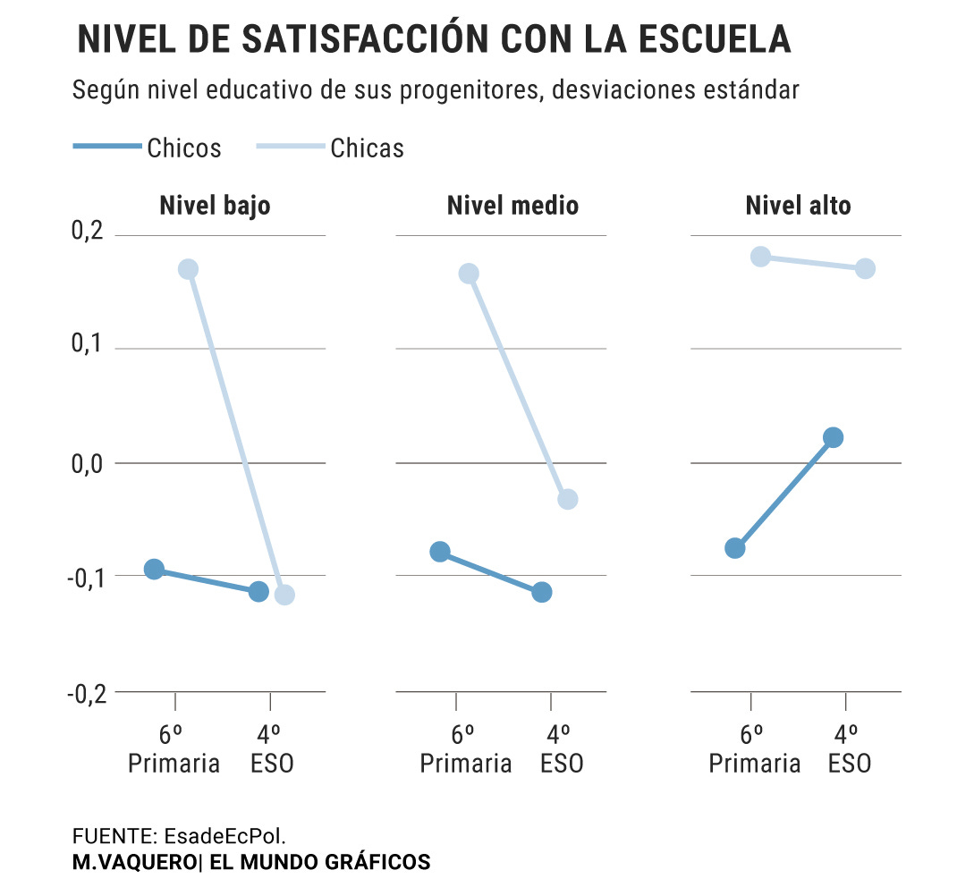 Olga Rodríguez pone el énfasis en la desigualdad de género en El Mundo con una hipótesis de una de las firmantes del estudio: “una de las variables que explican el fracaso de los chicos es la menor satisfacción con la escuela… Una de las razones es la falta de referentes, porque la mayoría de docentes son mujeres. Quizá una mayor participación de hombres en la enseñanza podría ayudar a que los chicos se sintiesen más reflejados y aumentase su satisfacción con la escuela”