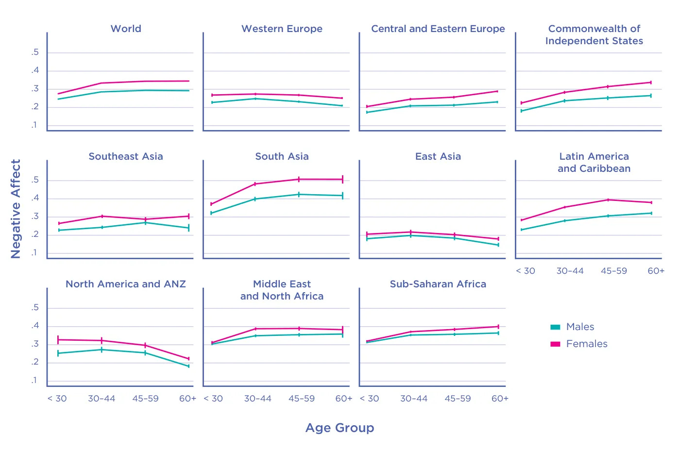 Algunos datos: las emociones negativas son más prevalentes en mujeres que en hombres en todas las regiones del mundo. Esta brecha es más amplia a mayor edad.