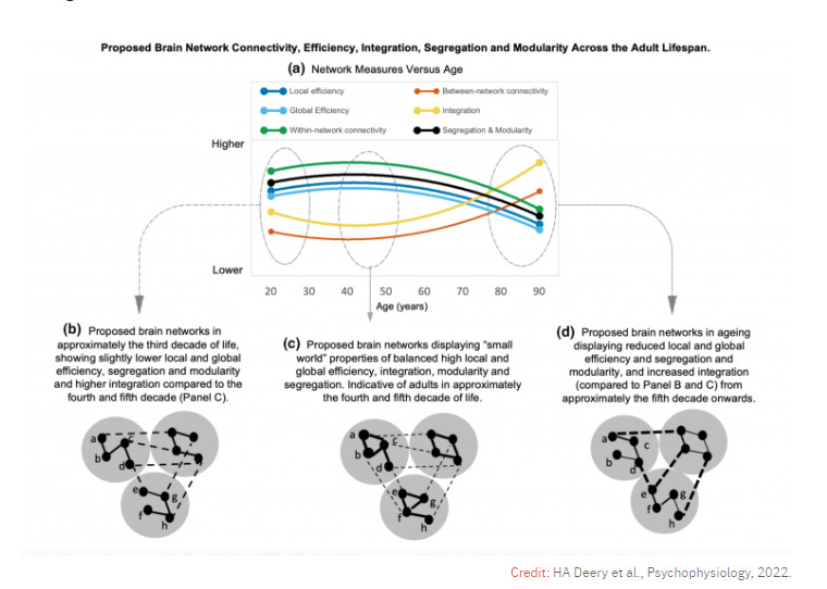“En la quinta década de la vida, nuestros cerebros comienzan a sufrir un "rediseño" radical que da como resultado que diversas redes se integren y conecten más durante las décadas siguientes, con los efectos correspondientes en la cognición. Es probable que los cambios en las redes se deban a que el cerebro se reorganiza para funcionar tan bien como puede con la disminución de los recursos y el "hardware" envejecido. Los adultos mayores tienden a mostrar un pensamiento menos flexible, como la formación de nuevos conceptos y el pensamiento abstracto, una menor inhibición de la respuesta, así como un razonamiento verbal y numérico más bajo” Ross Pomeroy en Big Thinking (en inglés)