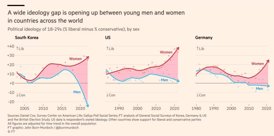 Estos días se ha compartido mucho una serie de gráficos y un artículo de John Burn-Murdoch en FT (en inglés). Su tesis es que en muchos países del mundo está surgiendo una brecha ideológica entre hombres y mujeres jóvenes, en la llamada “Generación Z”. Las chicas veintañeras son cada vez son más de izquierdas, los chicos se están yendo hacia la derecha.