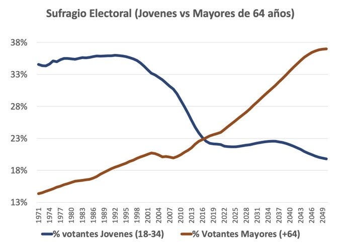 Escuchando a Conde Ruiz en el podcast Kapital de Joan Tubau sobre su “La Juventud atracada” (Amazon, Todos tus libros) es posible interpretar mejor la deriva de las políticas económicas en España. El cambio demográfico explica cómo el poder político se gira a contentar a la mayoría de votantes, cada vez más envejecida. Y de ahí sale la prioridad por el gasto en pensiones frente a la inversión en educación, políticas de empleo y vivienda o infraestructuras.