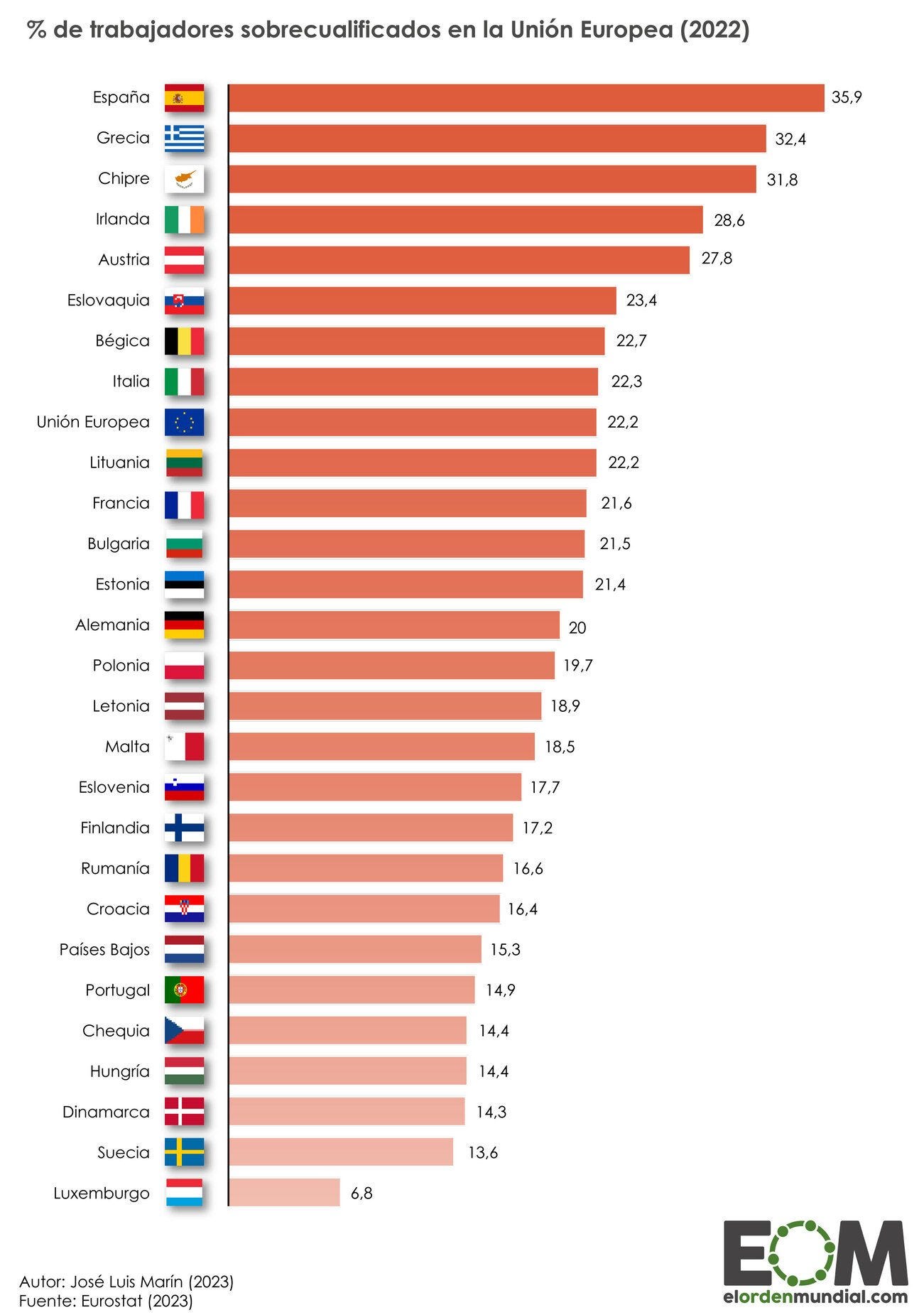 La sobrecualificación en la Unión Europea. Más de un tercio de la fuerza laboral en España está sobrecualificada en su puesto de trabajo. En Portugal o Suecia no llega al 15%. José Luis Marín en EOM a partir de datos de Eurostat.